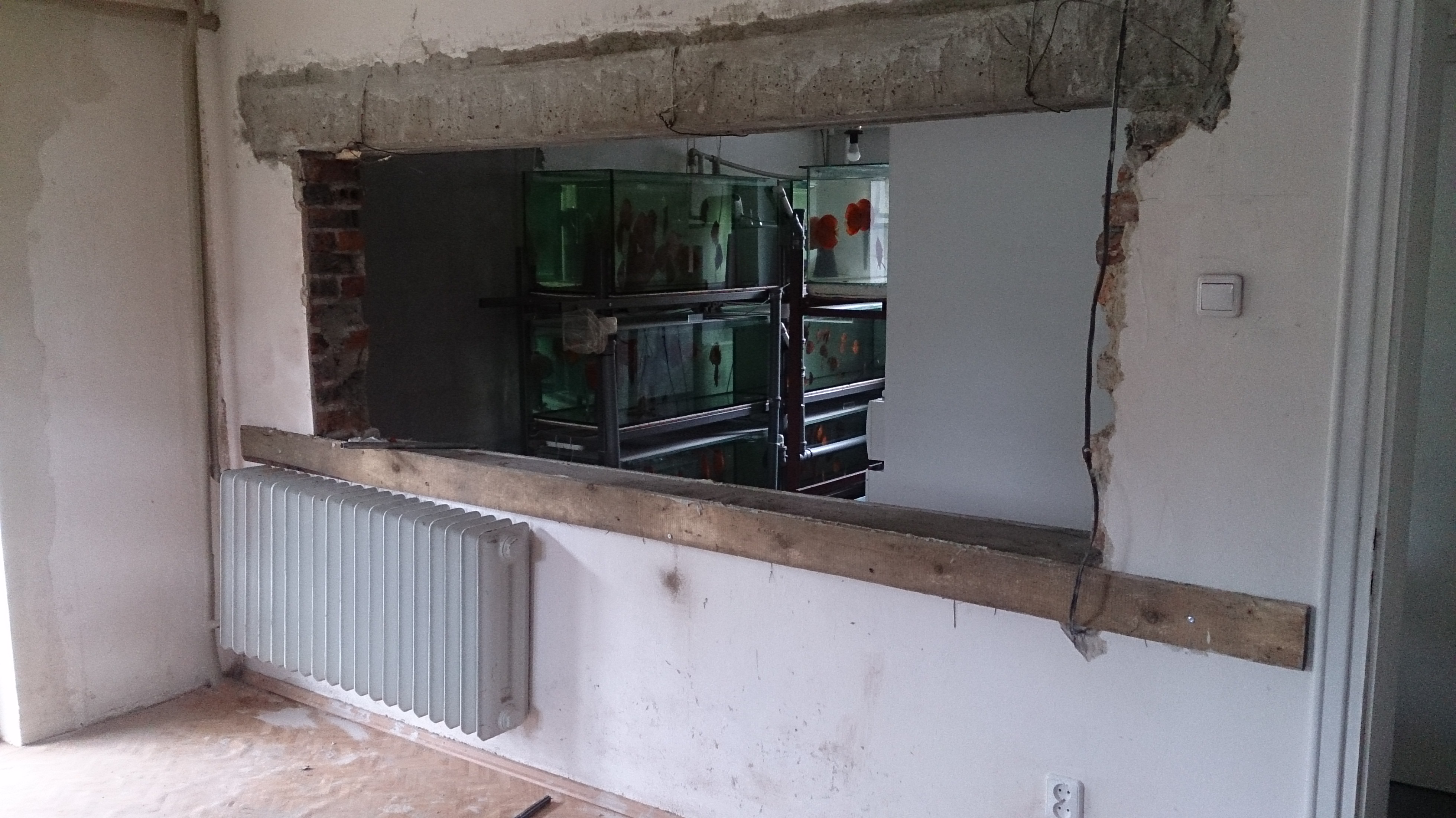 Był kaloryfer i go nie ma. Przebiłem się przez ścianę i z drugiej strony zamontowałem przyłącza pod montarz ogrzewania co, do sumpa. Jeszcze nie wiem jakie rozwiązanie zastosuje, albo wężownica w sumpie, albo wężownica w podłodze pod sumpem. To drugie rozwiązanie funkcjonuje w Mirka i się sprawdza